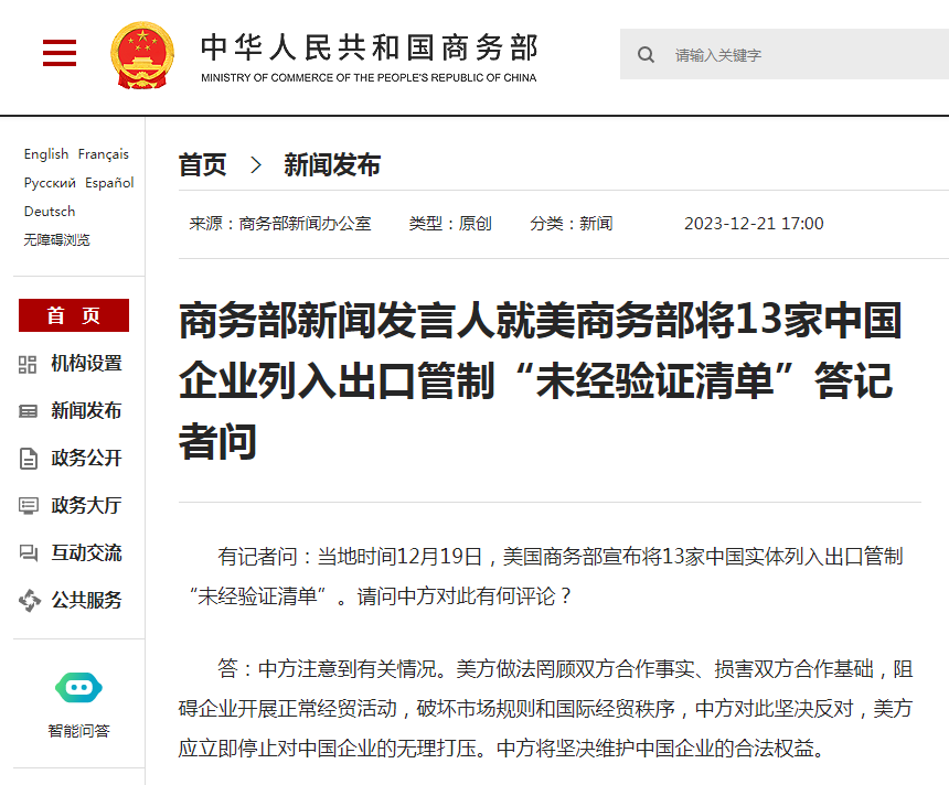 有记者问:当地时间12月19日,美国商务部宣布将13家中国实体列入出口管制“未经验证清单”。请问中方对此有何评论?